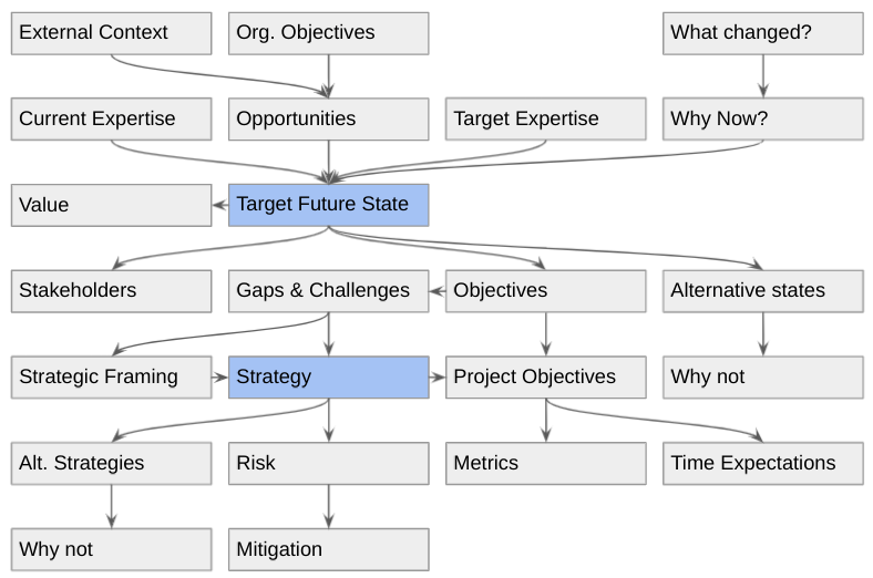 Alternate strategies: As with the target state, it’s worth calling out the other strategies that you considered and decided against.