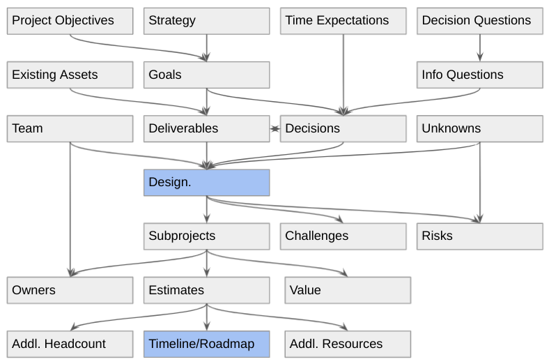 Value: Sometimes it can be unclear how each subproject contributes to the overall goal. This is particularly a problem when different audience members are used to thinking about different parts of the overall problem. This is where you make that explicit.